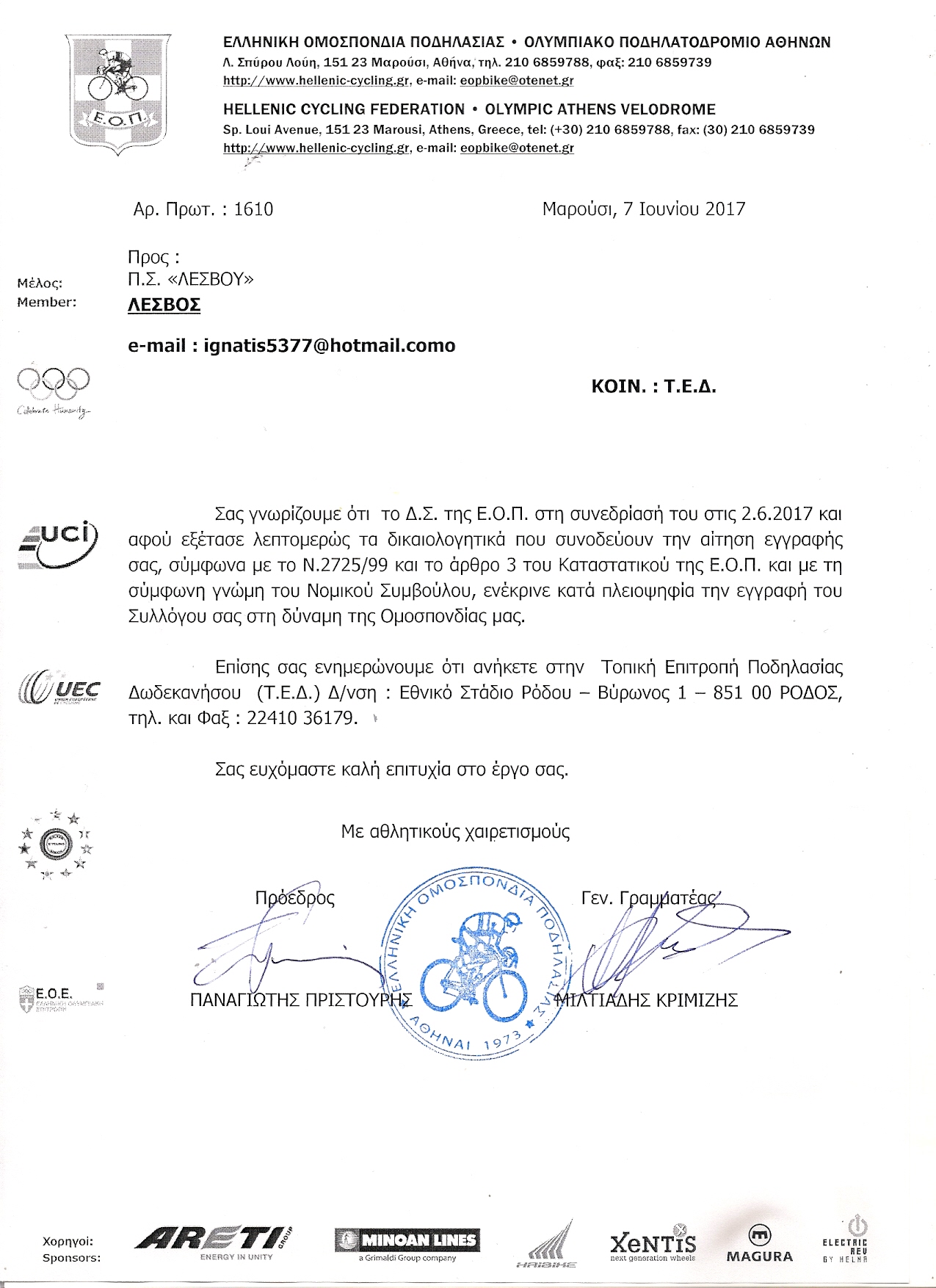 Με μεγάλη μας χαρά, σήμερα λάβαμε μια επιστολή από την Ελληνική Ομοσπονδία Ποδηλασίας με την οποία μας γνωστοποιήθηκε ότι από σήμερα 7 Ιουνίου 2017 ο Ποδηλατικός Σύλλογος Λέσβου είναι εγγεγραμμένος στην ΕΟΠ. Μια προσπάθεια πολλών μηνών απέδωσε και τώρα πια η Λέσβος έχει ενεργή ποδηλατική ομάδα και οι αθλητές της θα μπορούν να εκπροσωπούν το νησί μας σε όλες τις ποδηλατικές διοργανώσεις.