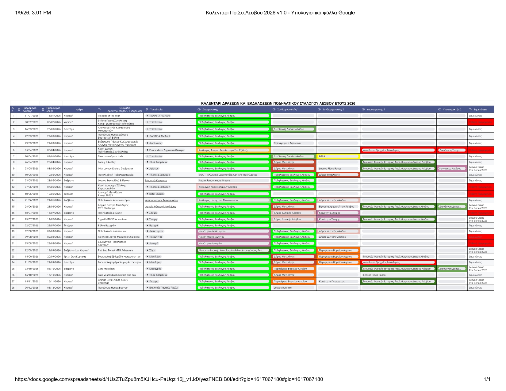 Σημείωση: Οι εκδηλώσεις του Ποδηλατικού Συλλόγου Λέσβου που αφορούν αγωνιστικές ποδηλατικές δραστηριότητες χρηματοδοτούνται και συν-διοργανώνονται από τους τοπικούς ΟΤΑ (Δήμο Μυτιλήνης, Δήμο Δυτικής Λέσβου και Περιφέρεια Βορείου Αιγαίου) και οι ημερομηνίες αυτών των εκδηλώσεων θα οριστικοποιηθούν σε συνέχεια της έγκρισης της χρηματοδότησης των παραπάνω εκδηλώσεων από τους τοπικούς ΟΤΑ.